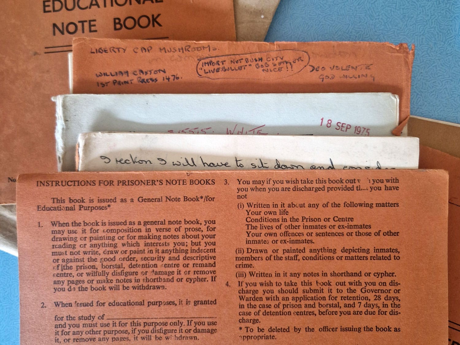 My dad wasn’t good at expressing his anger out loud either. Not with words, anyway. A few years ago I found the start of a novel he’d written while in prison in the 1970s. It’s spread throughout seven prison-issued exercise books, variations of faded beige and drab orange, with ‘GENERAL EDUCATIONAL NOTE BOOK’ printed on the front. Inside the front cover of ‘Volume I’ is a pull-out flap listing “Instructions for Prisoner’s Note Books” [sic].