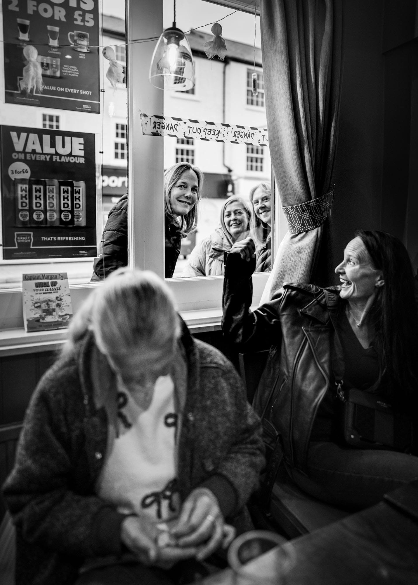 What I like about this picture is that, looking at it, you might think all the women in the picture, including me, knew each other, but we didn’t. I’d just met the three women looking through the window of this pub as I was contemplating how I’d be received if I went in and started taking pictures. In fact, they encouraged me to do it (that’s why they’re looking through the window). The woman counting her change didn’t know the woman waving at the three women outside, who in turn didn’t know the women she was waving at! We all came together in a happy mix. I think there’s a lot of humanity in it; it’s a natural impulse to wave and smile, even at strangers. By the end we all felt like we knew each other anyway.