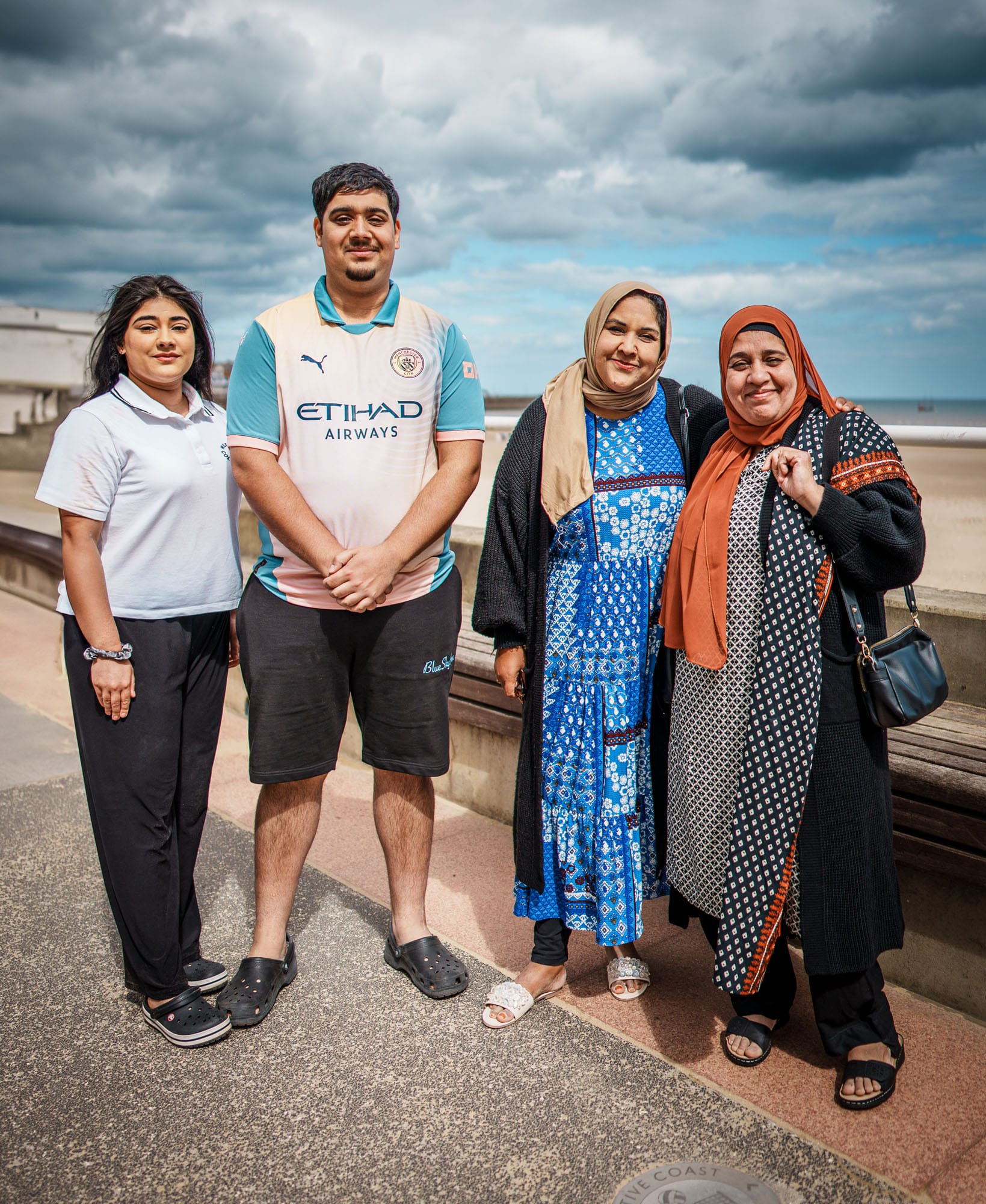 I met one of the older ladies in this picture outside a toilet block on a very hot day, and I asked to take her portrait against the blue sky. I didn’t realise that she was waiting for the rest of her family: her sister and their niece and nephew. When they came out, they were surprised to see her having an impromptu photo shoot with a stranger. The nephew was particularly amused, and also slightly embarrassed by this, but the aunties were so excited and insisted that he and his sister pose for a family portrait. They were so good-natured about it, but I did feel sympathy for the boy – my own son is mortified at the thought of me taking pictures of strangers and won’t let me anywhere near him with my camera – but this lad and his sister smiled dutifully and showed real affection for their aunties, who had taken them over to Bridlington from West Yorkshire for the day. I think having it recorded was quite special for them. It felt like it meant a lot, that day out for them together, so I was pleased I caught a fleeting moment of it as a little souvenir.
