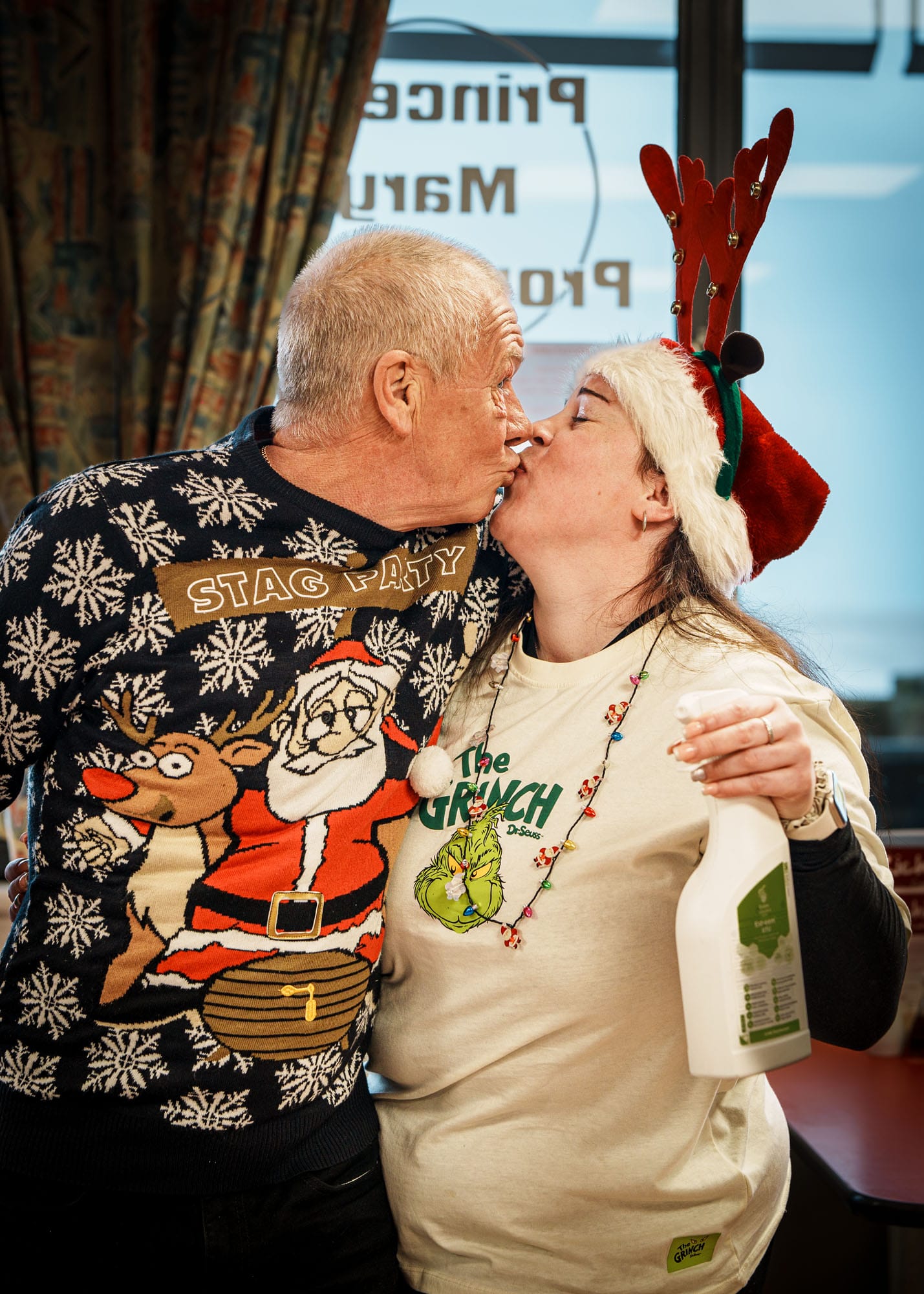 There’s a café in Bridlington which I like because it’s open every day; they have the longest menu I’ve ever seen (which I know isn’t always a good thing, but sometimes it is), and they let dogs in. So I often go in hoping to find a photogenic dog sitting at a table, but that day, just before Xmas, I met the cleaner and an amorous punter. I got the feeling they weren’t actually a couple before I took the pictures, but by the end of my time with them I definitely decided they might be. She was so cheerful, festively dashing around the tables, wiping the surfaces, and he was just happy to have her around. There was a lot of flirting and innuendo, and I was happy to encourage it. There was a lovely little spark between them, which I like to think was ignited by my shutter clicking.