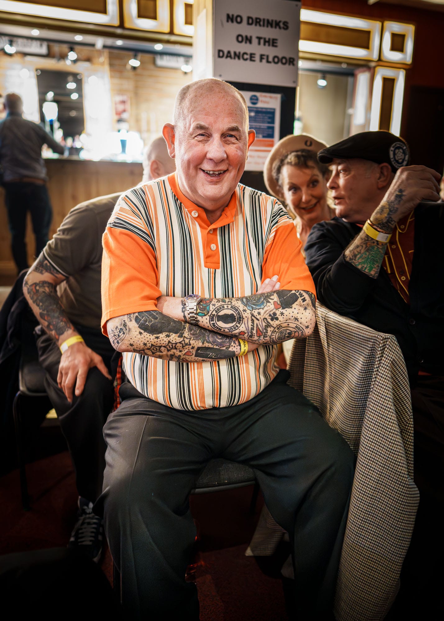 I took this at one of the monthly Northern Soul nights in Hornsea, where I live. My eldest brother, who knows a thing or two about Northern Soul, had warned me old soulies can be very protective of their scene, and might not welcome me taking my camera, but he couldn’t have been more wrong. They were very welcoming and proud, and they were keen for me to photograph them dancing. This is a portrait, though, and one of my favourites. There was his whole Northern Soul history in ink on his forearms, and while that became the focus of the picture, I think his face tells you what a great night he was having. He was dressed up, with his people, and dancing to the music he’s loved all his life – that’s going to make any man smile.