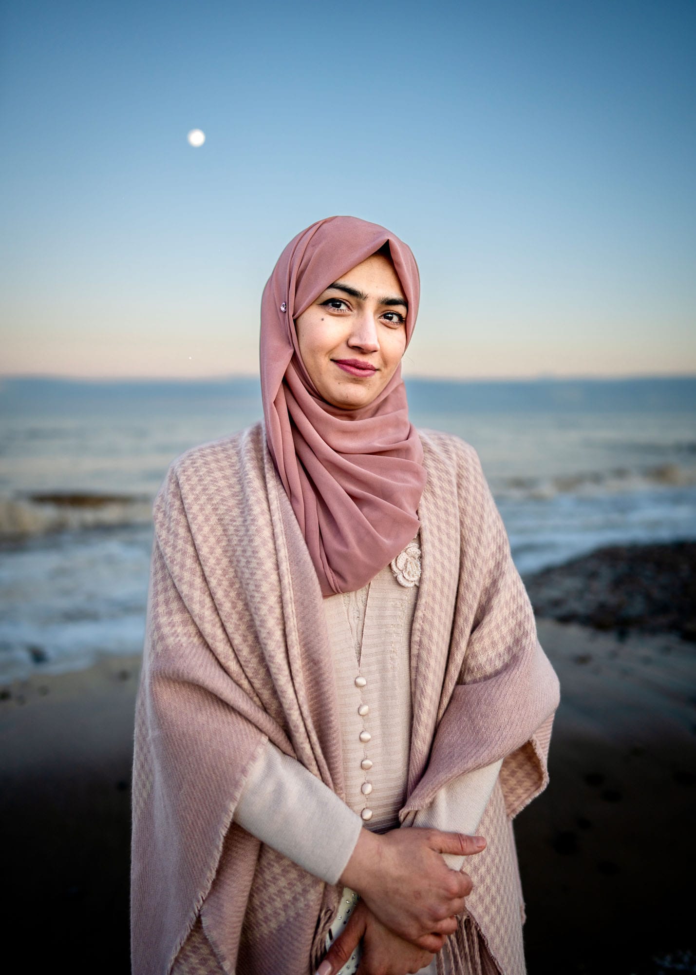 It was January when I met this girl with her friend, on one of those clear, pink-skied winter evenings that you know will bring frost. Although you can’t see it too well in the photo, the moon was massive and seemed to pearlise everything. I thought she was such a beautiful girl, and her clothes were of the same hues as the sky, so it was almost as though she was meant to be photographed there. Her friend was less confident, and when I sent them both the pictures later – which looked so happy – she asked not to have her picture shown anywhere. It felt a very serene moment on the beach on that cold, crisp night, and I love how enigmatic she looks in this picture. I did think when I left them, though, that if I’d been her mother I’d have begged her to have worn a coat! It was January on the east coast after all – and it may have been magical, but it was nithering!