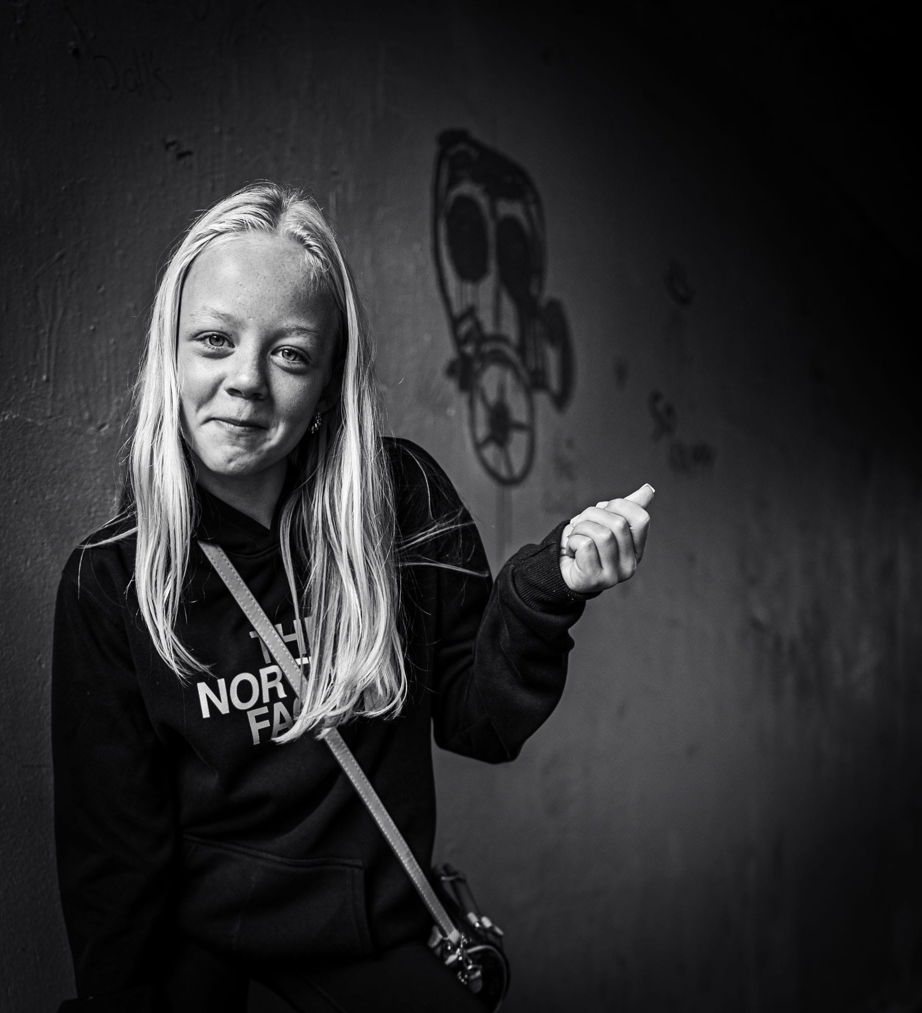 There’s a small underpass in my town that runs underneath a little section of the Pennine Way, and that day, as I was walking my dog, I bumped into a group of kids there. They were just hanging around, listening to music and fooling about amidst the knob graffiti and puddles of pee, as you do in an underpass. They were really interested in the camera I was holding, and they were really up for having photos taken. This is the generation who take photos of themselves all the time, so it was heartwarming to see how thrilled they were to have pictures taken by someone else with a camera that didn’t look like a phone. They weren’t at all self-conscious and just naturally fell into happy, sassy posing. This girl had startling blond hair and I thought the contrast of that with the dark tunnel worked well in black and white. They were all so excited to see the pictures – you’d have thought they’d never had a photo taken before. They were very sweet and I felt happy to have made them feel happy.